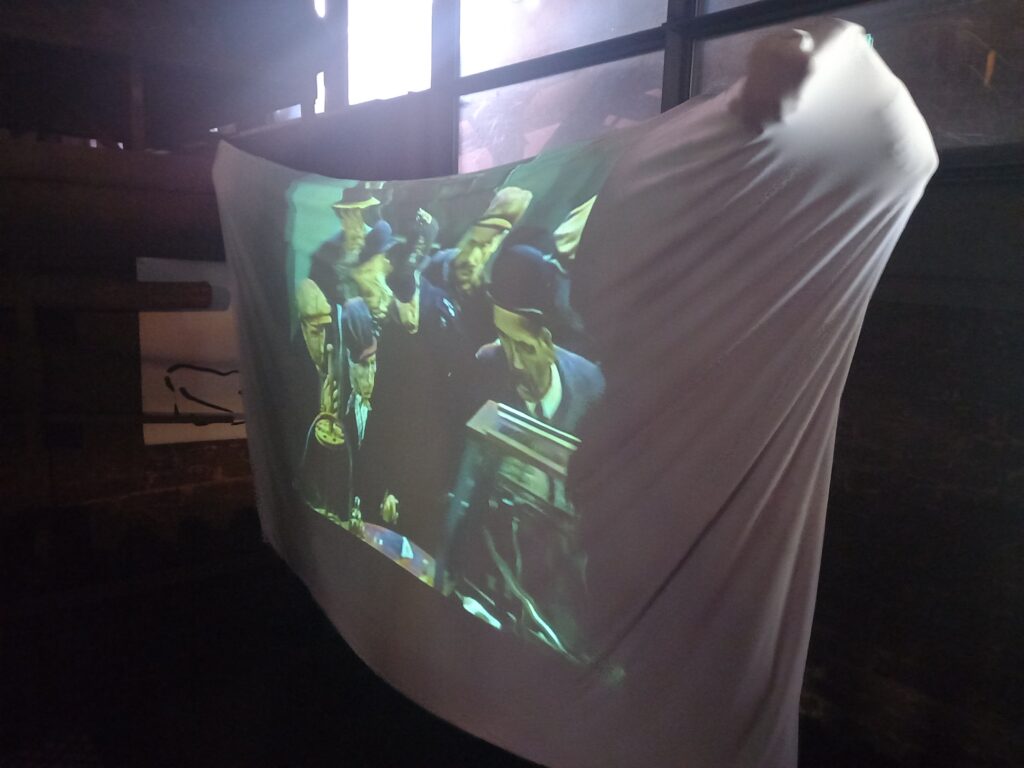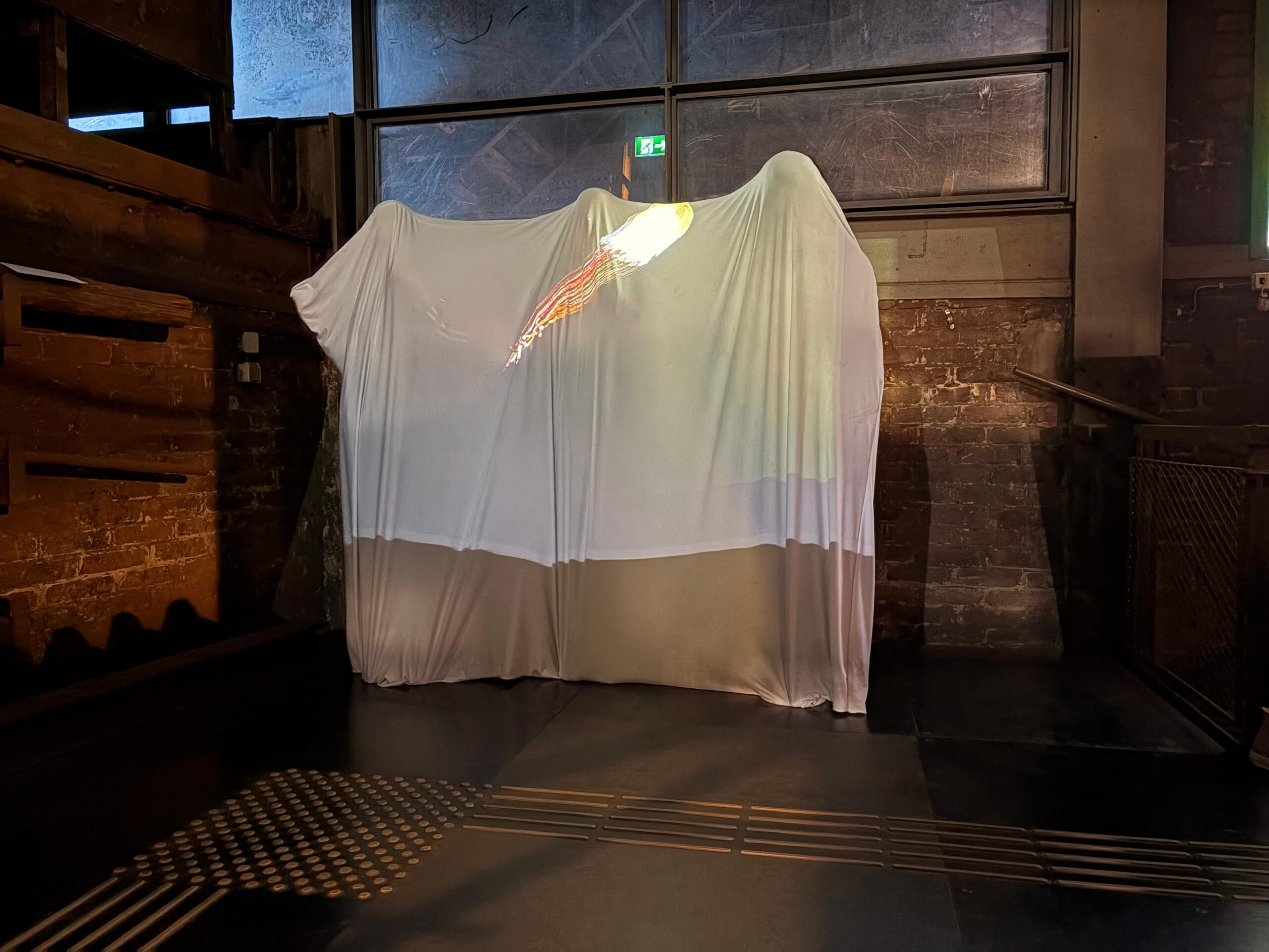 A science fiction film is projected onto a sculptural screen animated by the presence of a small group of performers. The screen distorts the images, giving them the appearance of a moving body, similar to the shape of an animal. In this fantasy of a living cinema, a chorus of voices asks questions that remain unanswered. The performance took place during the exhibition Angry Textile, Weltkulturerbe Völklinger Hütte, Völklingen, 2025, curated by Prof. Georg Winter and promoted by the Europäischen Zentrums für Promenadologie Völklingen, Spekulativen Nomad*innen, HBKsaar, and Weltkulturerbe Völklinger Hütte. Performers: Amrei Treis, Thelio Rabin-Laguens, Samuele Lascialfari.