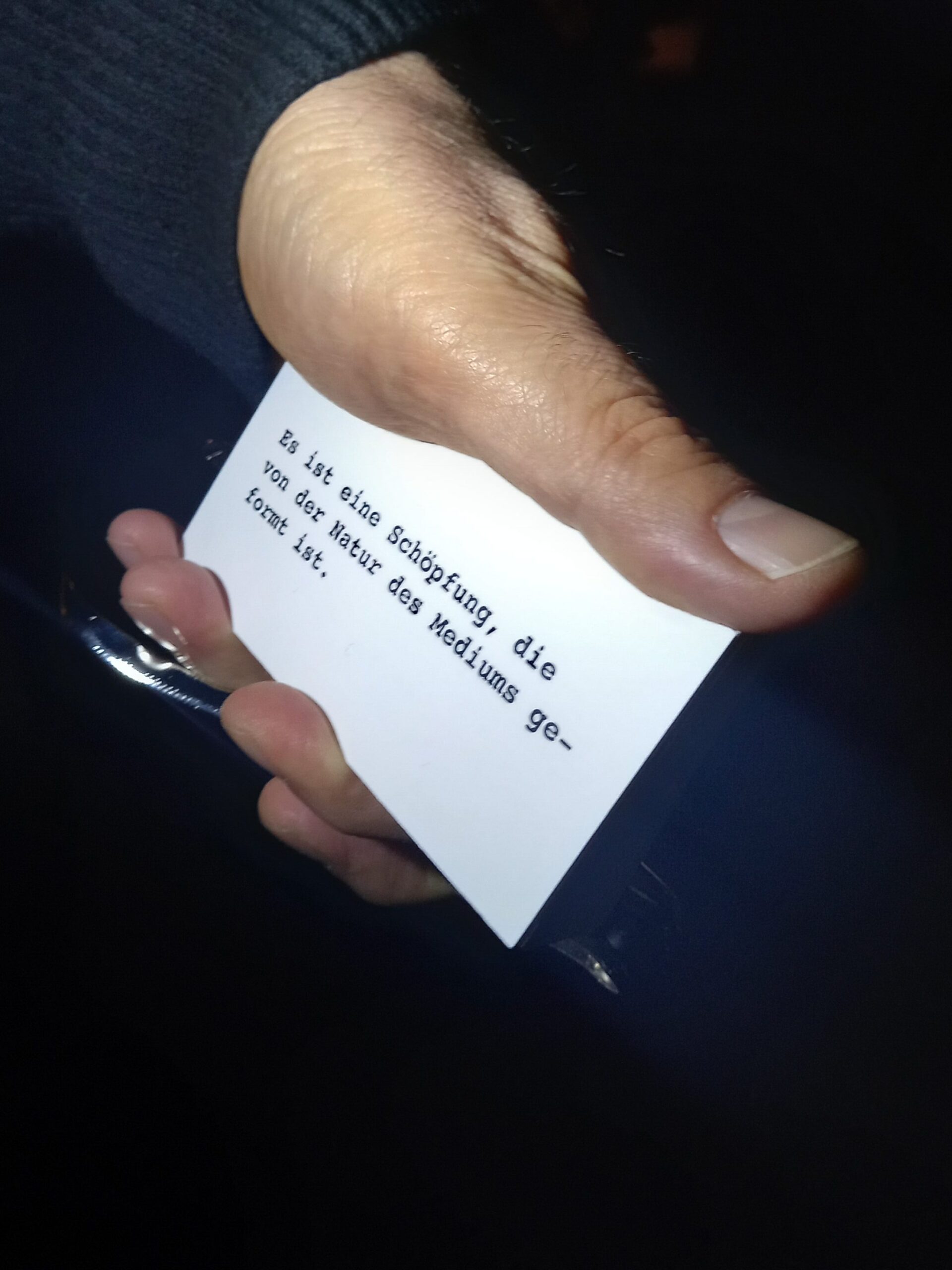 Video-proiezione su schermo animato, testi, suono e voci digitali, tre performer. Montaggio video, schermo e azione: Tilla Giro. Testi, voci e montaggio sonoro: Pasquale Polidori / Video projection on animated screen, texts, digital sound and voices, three performers. Video editing, screen and action: Tilla Giro. Texts, voices and soundtrack editing: Pasquale Polidori